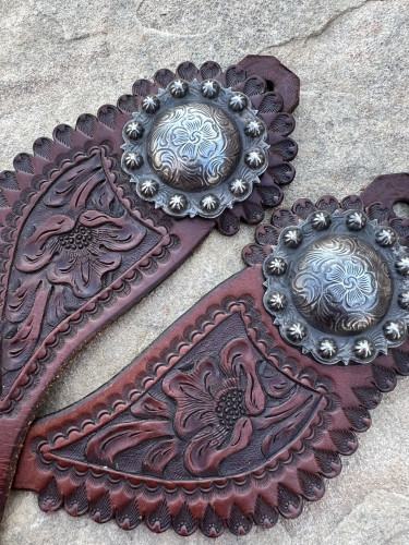 A great pair of straps with conchos from the late Buddie Foster. We all know how great he made leather items and these are exceptional with deep tooling. Not a big pair just a right size and soft and added with a great silver concho.