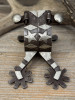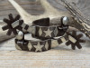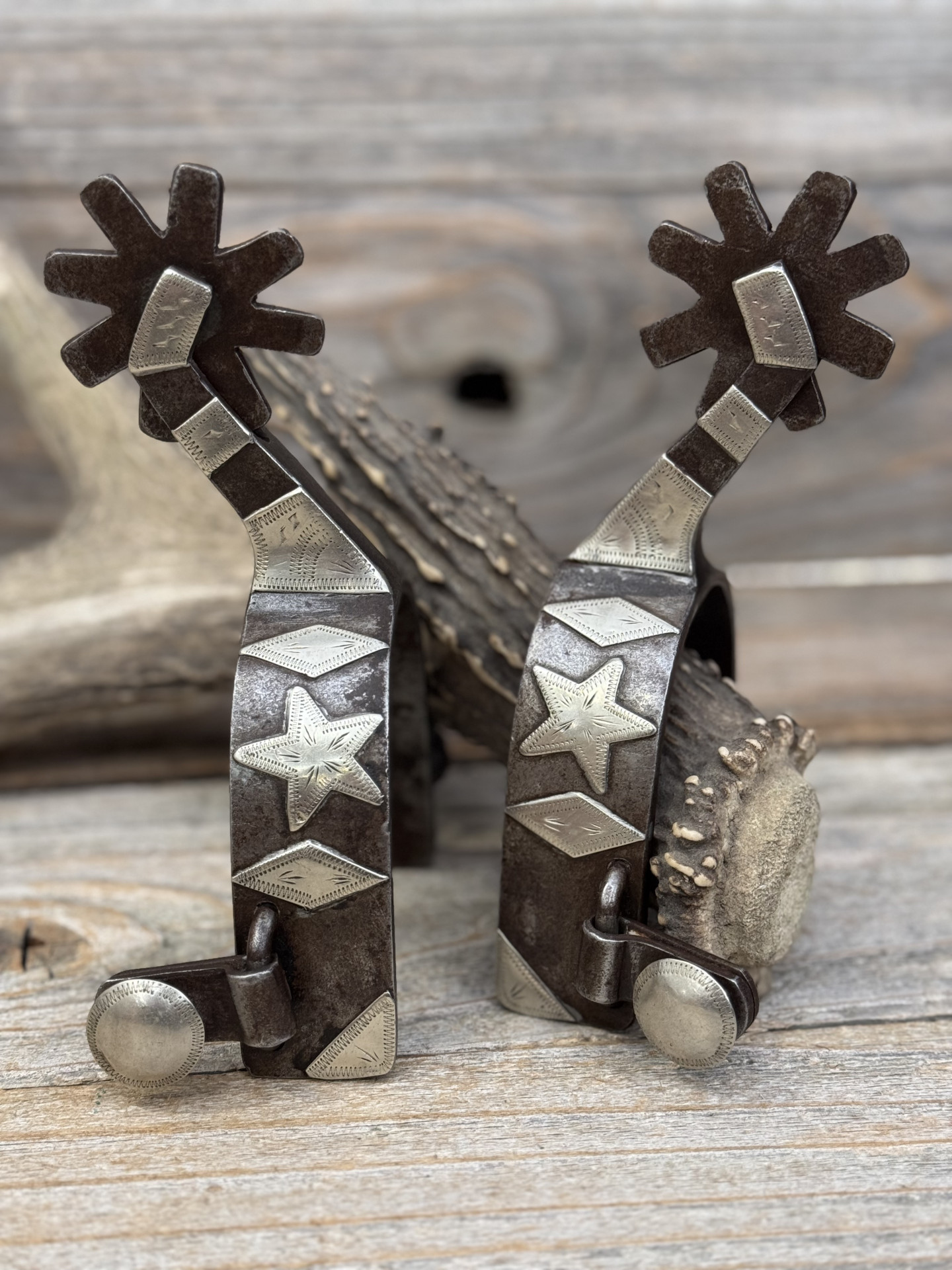 Carl "HALL" marked pair of Texas silver overlaid "diamonds & star" mounted spurs. Silver overlay also on shanks, heel end and buttons. Rowel Diameter: 2 1/8" Number of points on Rowel: 8, Heel band opening: 3 3/8", Overall length: 7". Price includes shipping to the CONUS. If interested, please call/text my cell number. Thx