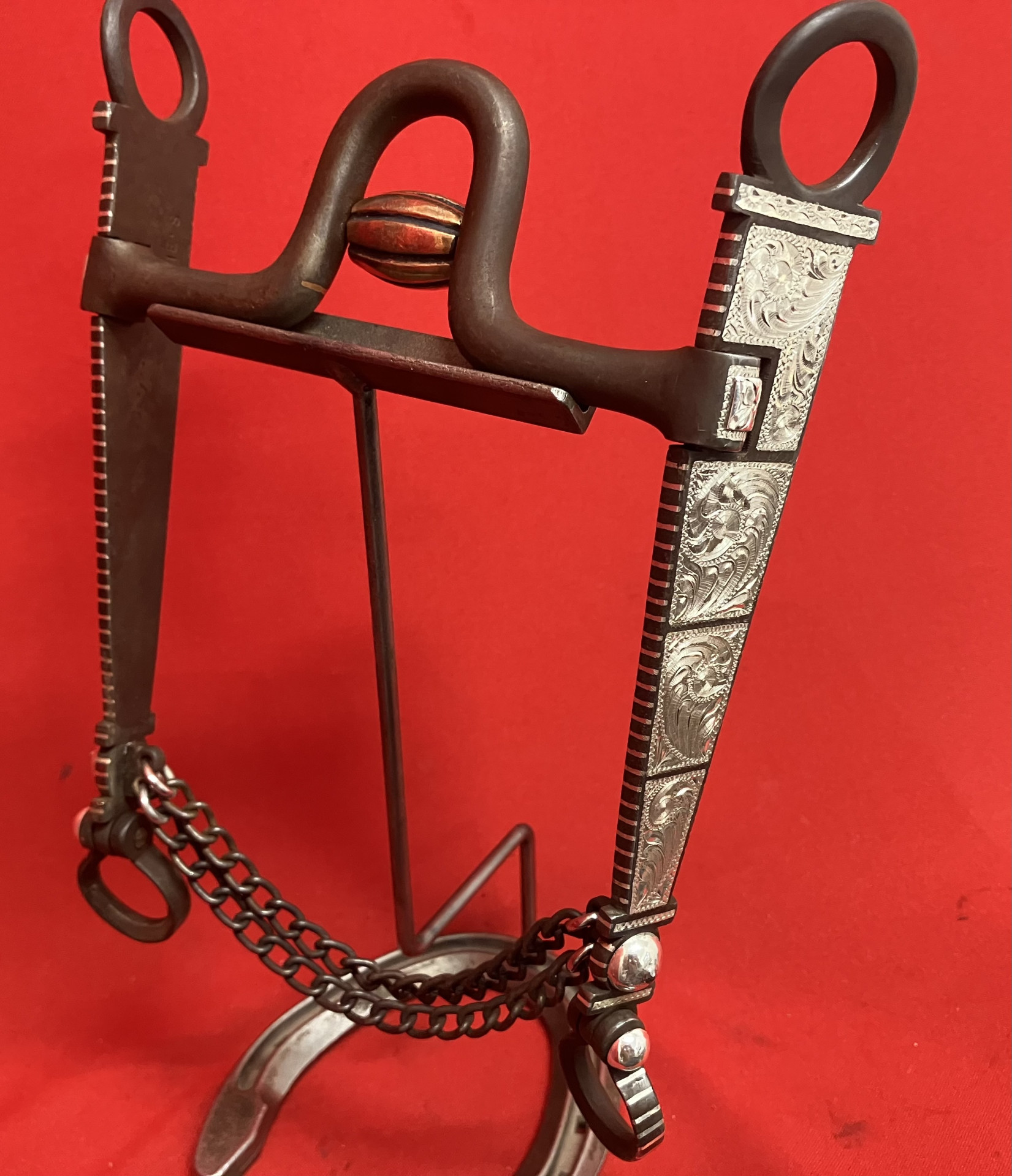 Pure silver inlaid bit with 7 3/8" loosed cheeks, copper inlays in the 5 3/16" mouth, copper cricket. Very popular cheek and mouth combo. We pay shipping within the 48 states and accept most forms of payment.