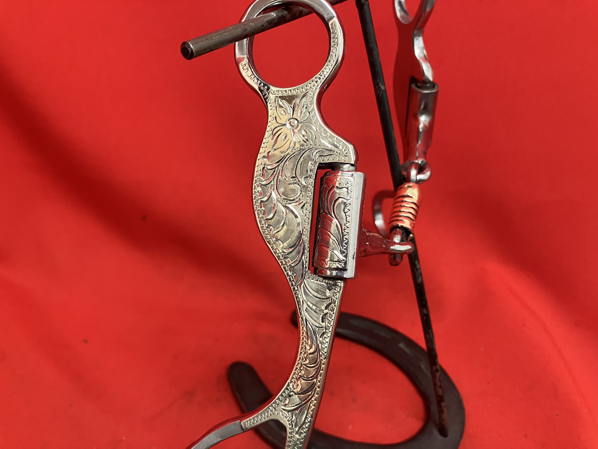 LH marked bit by well known maker Leon Hughes from NE Oklahoma. In his 80’s he continues to make top shelf horseman’s tools. This one is unused and has a 5 1/8" mouth and 6 3/8" overlaid cheeks. Overlaid with silver and a little copper. We pay shipping within the USA. We accept most forms of payment.