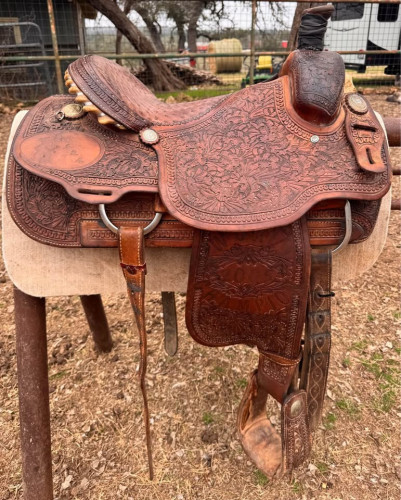 Saddles for Sale: 15 Inch Fully Tooled ETS Roping Saddle SOLD #195662