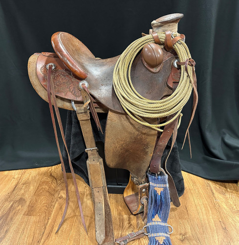 Freckers Wade Saddle w/ Denim Blue Ostrich Breast Collar and Headstall with 5” Jeremiah Watt snaffle w/copper inlay. Saddle also has J Watt conches. Includes hand made mohair cinch and 1/2” Alpaca hair Macate Rope reins 6 str 22’