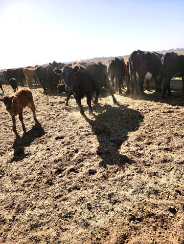 35 head of 2 & 3 year old red and black cows. A few solid mouth black cows, 5 years old. Everything has calves on there side. Calves are red and black angus cross calves. There are a few black baldie cows as well.