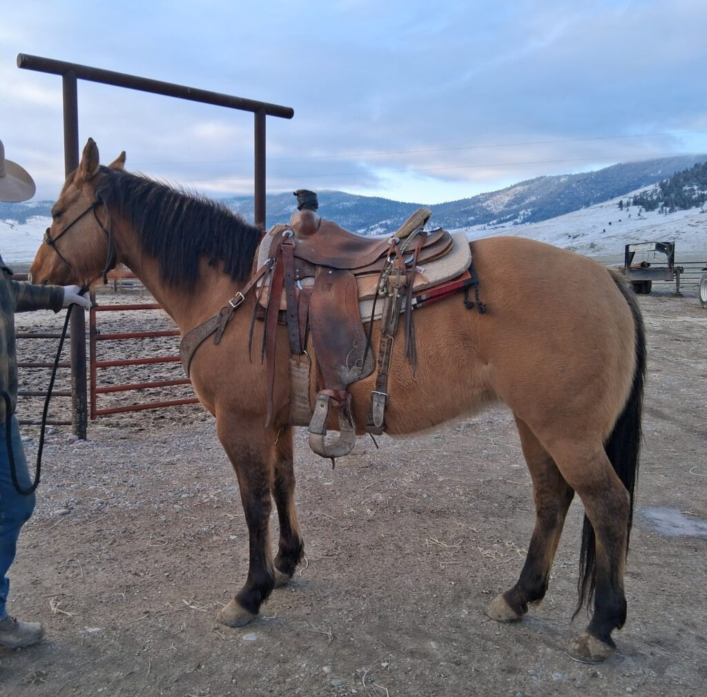 Good to catch and shoe, no buck. Rode in the mountains and used on the ranch to move and gather cattle. Tough horse that will go all day. Not a rope horse, can be a little watchy when fresh but comes down quick.