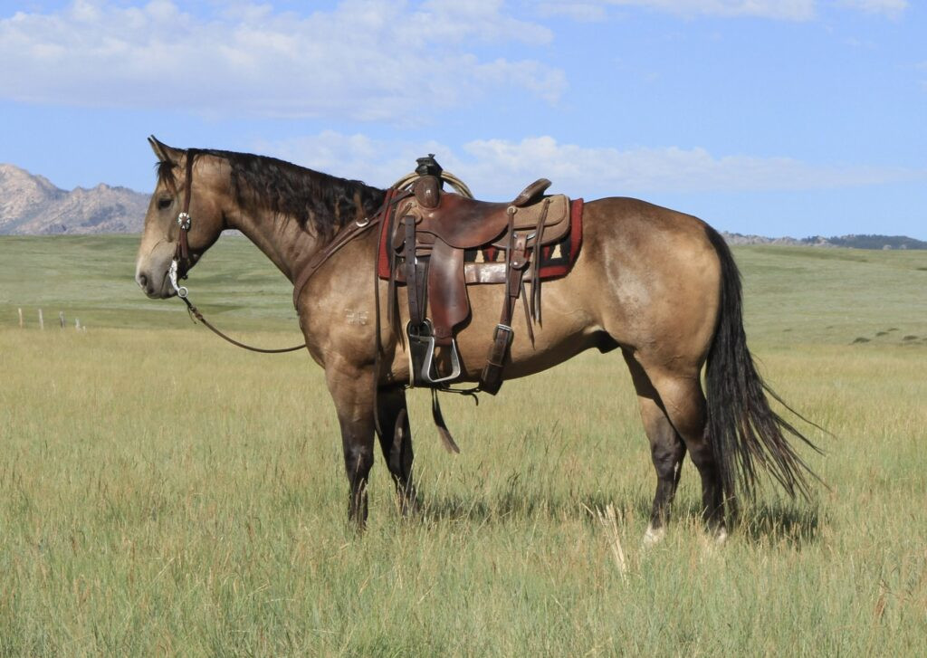15.1 hands, 1250 lbs Sired by Famous Black Ty, put together in dark buckskin and 100% sound! We have had Monty for two years. We have ridden him in the arena and around the ranch to gather cow calf pairs, run the saddlehorses off pasture, and trail ride. He is good through creeks, hills, rocks, is comfortable behind cattle and carries himself well. He has a lot of speed in his bloodlines but we have not ridden him fast and he has a quiet way of being. Monty has had a lot of arena time and is pleasant to ride with a soft mouth and sides, comfortable gaits and a desire to please. We laid him off for 6 months this winter and he came back honest and gentle with all the same handle he had when we turned him out. No maintenance.