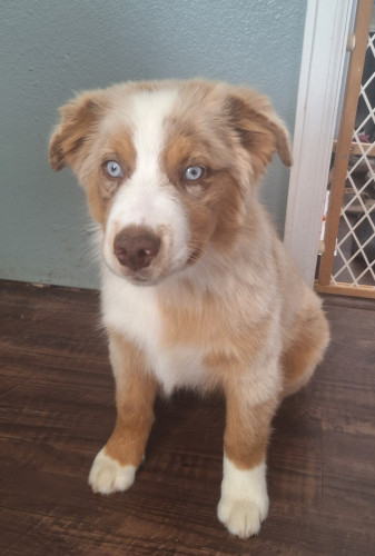 This Australian Shepherd pup is ASDR registered, has tail docked, dew claws removed, and has had two rounds of shots. He has been exposed to children, cats, chickens, goats, and cattle. Parents have great instincts when it comes to working livestock. This handsome little guy is going to be on the small side of a standard/large side of the mini. Other families that have taken our pups have all commented about how well behaved they are and how easy they are to train. We have 1 male left.