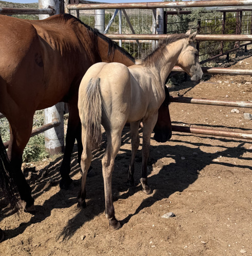 2025 dun quarter horse filly. Raised outside on a rough country, West Texas ranch. Pending registration with the AQHA. Deposit required to hold the foal until they are weaned.