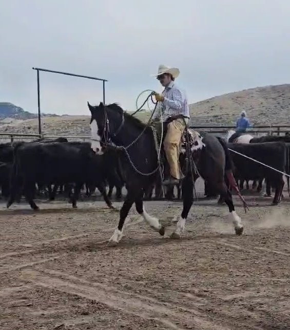 15.1 hands and wears an 0 shoe all the way around. He’s very gentle, wants to be your buddy. In your pocket type of horse. He’s been to elk camp as a pack horse. He’s trailed/moved cows. He’s spent this last spring in the branding pen dragging calves. He’s a super quite easy going horse. Absolutely no buck or kick.