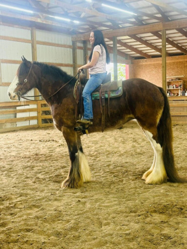 Registered with the Clydesdale Breeders of the U.S.A. 16.2hh. Lucy stands to be tacked, vet and farrier. She is very well broke to ride and drive, she’s also been trail ridden and shown! She will go anywhere you point her out on the trail, and stands for a mounting block. She is sound and a big puppy to be around. She raises nice babies and is a great mother as well if you want to go that route. She’s easy to catch, stalls great and is a pleasure to own! Lucy’s tail drags the ground, and she has very flashy moment as well. She’s soft in the bridle and rides like a small horse.