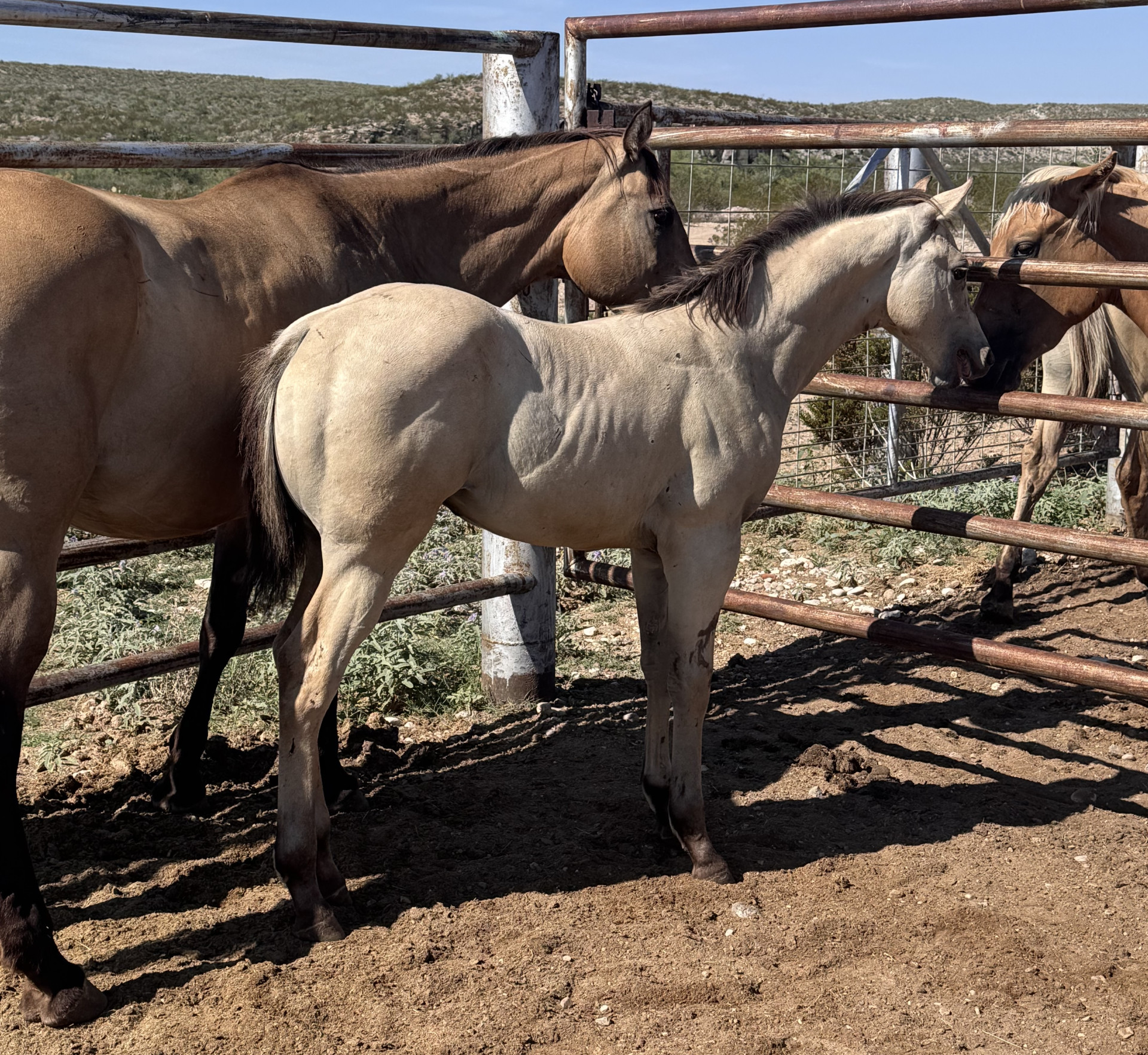 2025 dun quarter horse colt. Raised outside on a rough country, West Texas ranch. Pending registration with the AQHA. Deposit required to hold the foal until they are weaned.