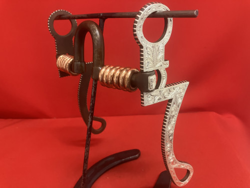Well done a very usable bit marked CHARLIE’S. Made for Charlie’s by long time silver and steel artisians in Mexico. Ride good and look good. Inlaid with pure silver. 7 3/8" cheeks. 5 1/8" mouth with copper rings. A good horseman’s tool. We pay shipping within the 48 states and accept most forms of payment.