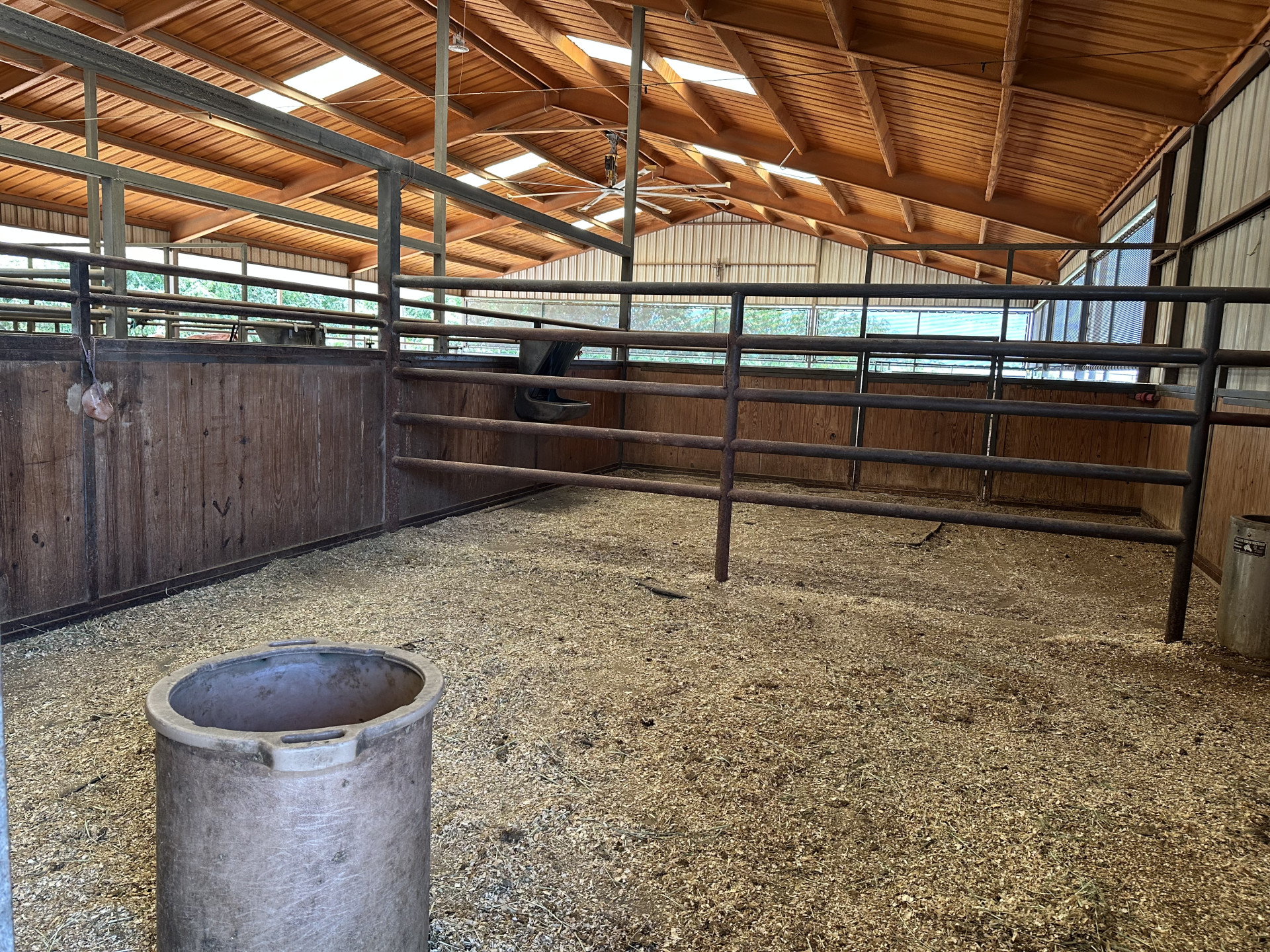 leads to a temperature controlled tack/feed room, another water pump room, as well as an additional temperature controlled office with windows that look directly at the horses in the stalls. There is also a 10 ft indoor wash bay with hot and cold water access and drain for chilly days where horses need to be hosed off. Connected to the barn are a few more beneficial spaces. A small pen for ponies/goats/a few steers, an outdoor wash rack, and completely fenced dog yard.
