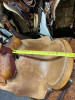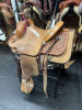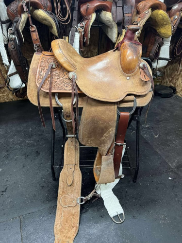 This saddle features a 14" rough-out hard seat, 3 1/2" cantle, 6 long leather ties, rough-out fenders, pre-twisted stirrups, stainless rigging, post horn with new leather dally wrap, 7" gullet, FQH bars, huge working back cinch, fleece is great, weight is around 40 Pounds.