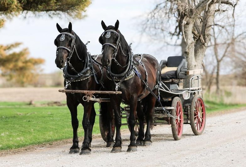 "Kase & Kade" 4 yr. old Flashy Pair of Black Percheron Geldings. Broke to drive and stand 17.1hh. They’re a well-matched team, with long tails. Kase and Kade are a solid team. They have been used on all different farm equipment, including hauling manure, cutting and raking hay. We have had them through parades, through town, and down busy highways. They’re friendly, quiet, easy to handle, easy to harness and hitch. Kase and Kade are not a team you have to drive every day; you can let them sit and they drive the same the next time you get them out.