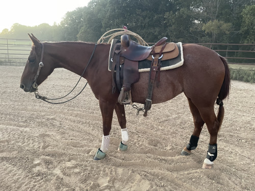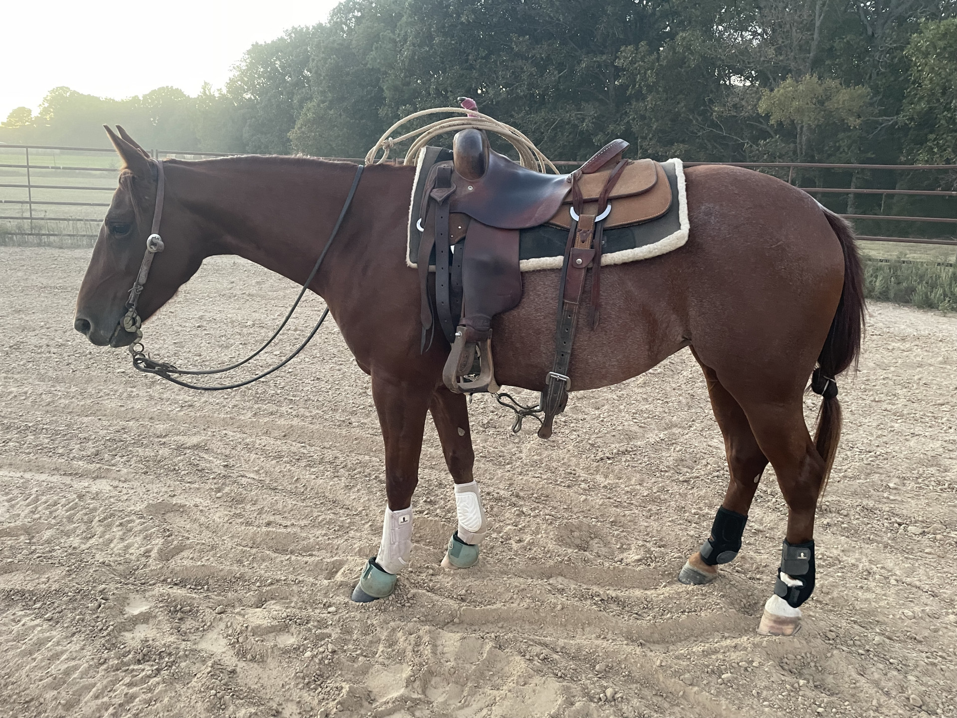 Squeaks has a ton of natural draw and stop,lopes nice circles, neck reins, soft in the face, has smooth departures, rides in and out of arena has worked the mechanical flag and started tracking the roping dummy. Squeaks would be a great asset to someone’s barn whether it be showing ranch horse, trails or roping. PPE’s are welcome! come try her out!! 6 panel N/N