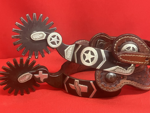 Spurs and buckles by the late R.F. Ford who made spurs and bits for years in the San Angelo area. This pair appears to be unworn and were originally made for Larry Peck and ended up in the collection of the late Mack White of Canyon, Tx. Spurs are marked R.F. FORD SAN ANGELO, TX. NO. 1252 and the buckles are marked R.F. FORD. Feature 2 1/2" rowels, 2 5/8" shanks, 1 1/8" bands, 3 7/16" heel openings. Nice collectible pair by the late award winning maker. We pay shipping within the 48 states and accept most forms of payment.