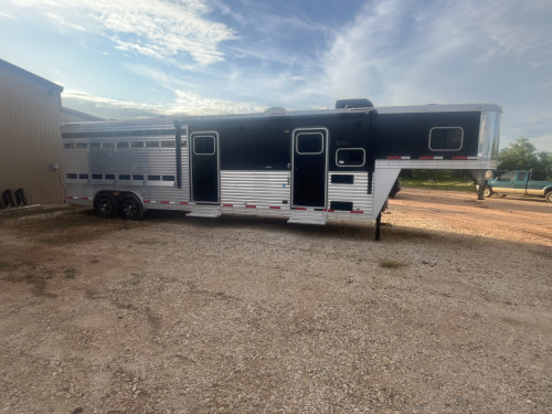 2014 Sooner. Converted to 5 horse slant. 10 short wall everything works like new. 4’ midtack with bunk beds. All new skin due to hail storm. Insulated roof. Lot of extra lights. Trailer is very lightly used.