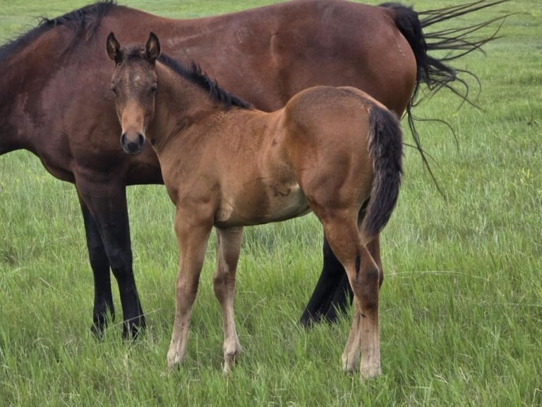 “Sam” is a bay colt with only a small dot on his forehead. His dam is Lethas Lena aka Lena. She is a sweet well-built stocky bay mare. Her sire is Lethal Playgun owned by GBL Farms. He has a black type pedigree inclusive of multiple maternal money earning siblings (one being Thomas E. Hughes) having earned more than $812,000. Lethal Playgun’s dam, Smart Letha, is Equistat #83 all-time leading dam and has paternal siblings with earnings in excess of over $9 million. Lethal Playgun was awarded his Performance ROM in 2005 and is a NDQHA Derby Money Earner. He is a proven producer of money earners in NCHA, NRHA, and NRCHA as well as AQHA point earners. He has also produced winners in barrel racing, roping, and open show events. He himself doesn’t have any earnings, but he did acquire some points in AQHA reining. The other names on “Lena’s” papers are just stacked with money earners!! Lena’s dam side is just as impressive and brings more of the older foundation bred athletes to her pedigree. What really attracted us to her on the bottom was Peponita. We currently have 3 granddaughters of Peponita and really love what they have done for our program, so to be able to add another was an opportunity we couldn’t pass up! Click on her webpage to read more about what she has to offer. Her first foal 2019 Whiskey Up Zena JW, went to Illinois. Her 2021 foal, Whiskey Up Basil JW, is now deceased. Her 2022 foal by Walter O Rielly, Eel Drift JW, was sold. Her 2023 foal, Sandstone Drift JW, went to a ranching family in ID. Her 2024 bay colt, Paddys Gin Ixion JW, is now in TX.