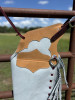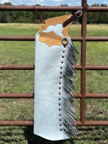 For Sale: DIXON CHAPS Light Blue & Tan Rough Out Full Zippered Shotg*n Chaps with Fringe (#275) #199734