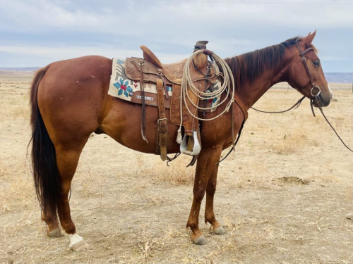 Hardy is a very nice young gelding with loads of potential to go in many different directions of ranch or cattle work. He is gentle, easy to catch and good to handle. Hardy has been ridden many miles in the mountains gathering and moving cattle. He travels out really nice and watches where he puts his feet. Hardy has also been roped off of outside and ponied young colts. He’s 100% sound and ready to progress his training in any area you’d like.
