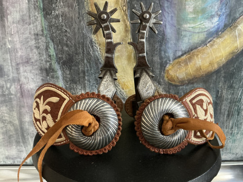 Mike Morales Unmarked Spurs with super big 2.5” conchos on leathers. Spurs are in great conditions, single mounted, with silver inlays.