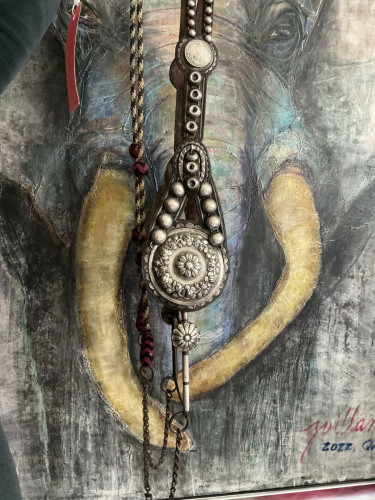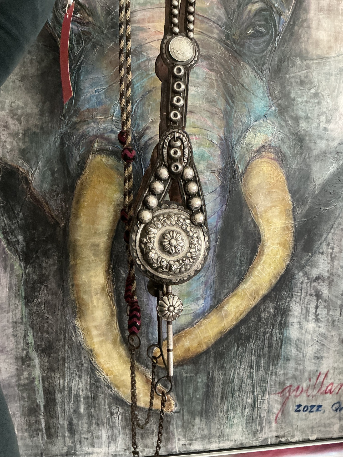 Elegant and artistic silver mounted Mexican Bridle with historic Hollywood cowboy pedigree, acquired directly from the Buck Jones’ family in 1952. The crown piece is adorned with two rows of silver spots leading to a domed Peso concho sitting atop a silver scalloped washer. The cheek piece is adorned with dual wide silver thread separated by silver grommets. The cheeks then broaden to reveal an elaborate and opulent hanger with four domed spots leading to a stunning, oversized repousse floral scalloped concho. The original period bit has narrow rounded cheeks with a single flower silver concho. Reins chains attached to traditional closed fabric rein in natural being and black with burgundy and blue woven buttons. Fine condition, circa 1880s.