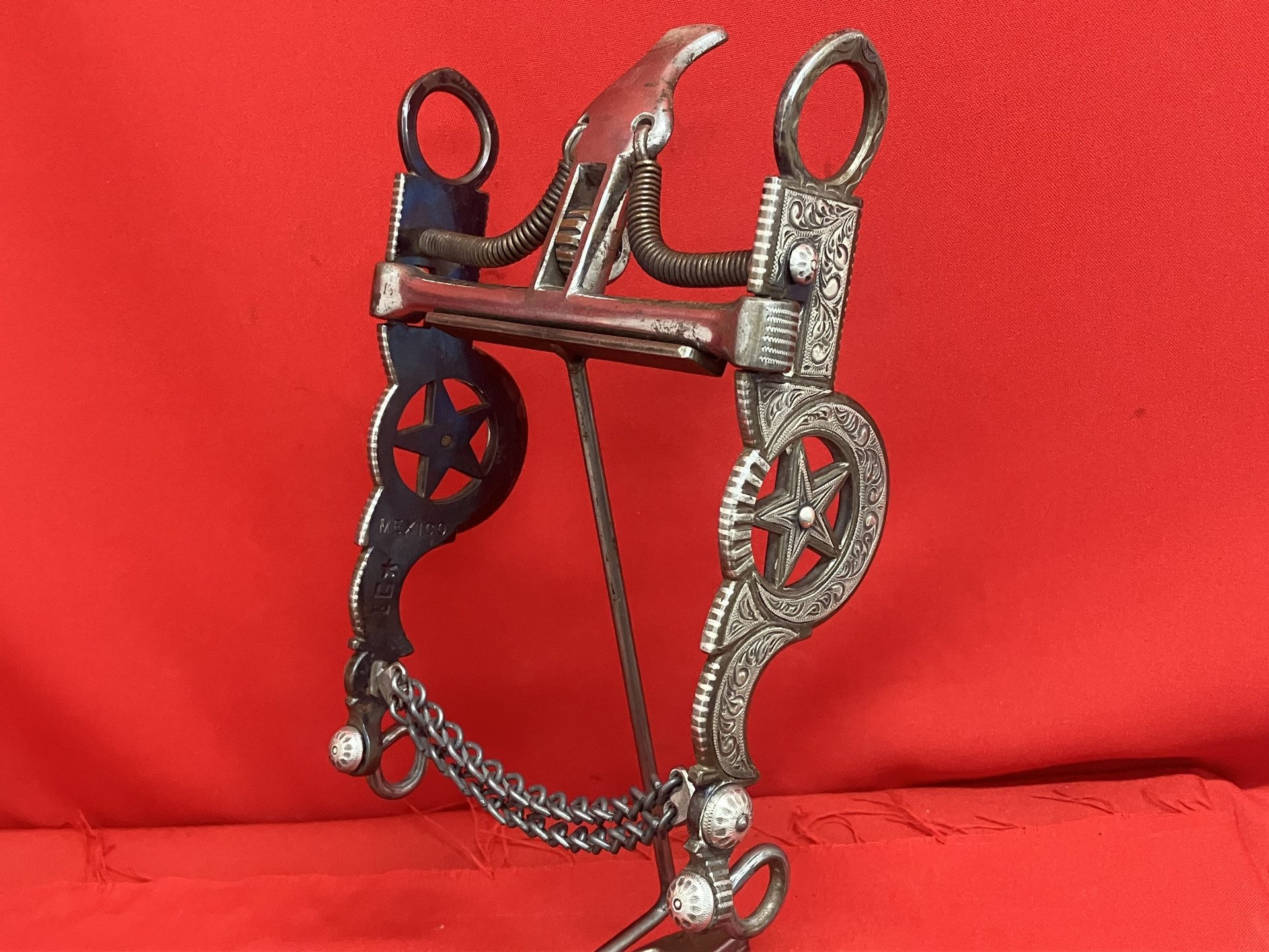Offering one of the finest Grijalva bits that I have seen. It is in unused condition with original blue. It is marked EG* MEXICO. Very well done engraving. I am thinking early 1970’s. Copper on the back of the 3 3/8" spade. 5 3/16" mouth. 7 3/8" cheeks. It is special. We pay shipping within the 48 states and accept most forms of payment.