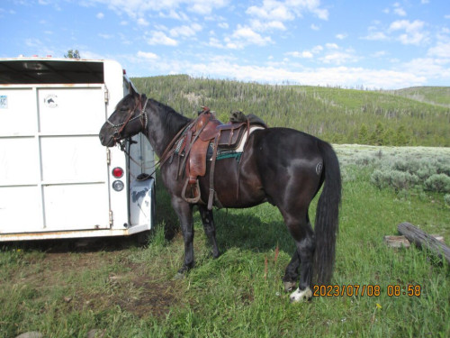 15.1 hands a solid 1250 pounds. Andy is a perfect example of the ideal draft cross with his loveable personality and versatility under the saddle. Easy to catch and one of the first to greet you in the pasture. He has been out by himself and walks back the same. Been rode in the backcountry of Yellowstone. He has been hooked, but I never drove him. Andy is coal black. Loads and hauls easy. Andy is up to date on his vaccinations, teeth, and shoeing. PPEs welcome at buyer’s expense. I have videos of Andy in the park.