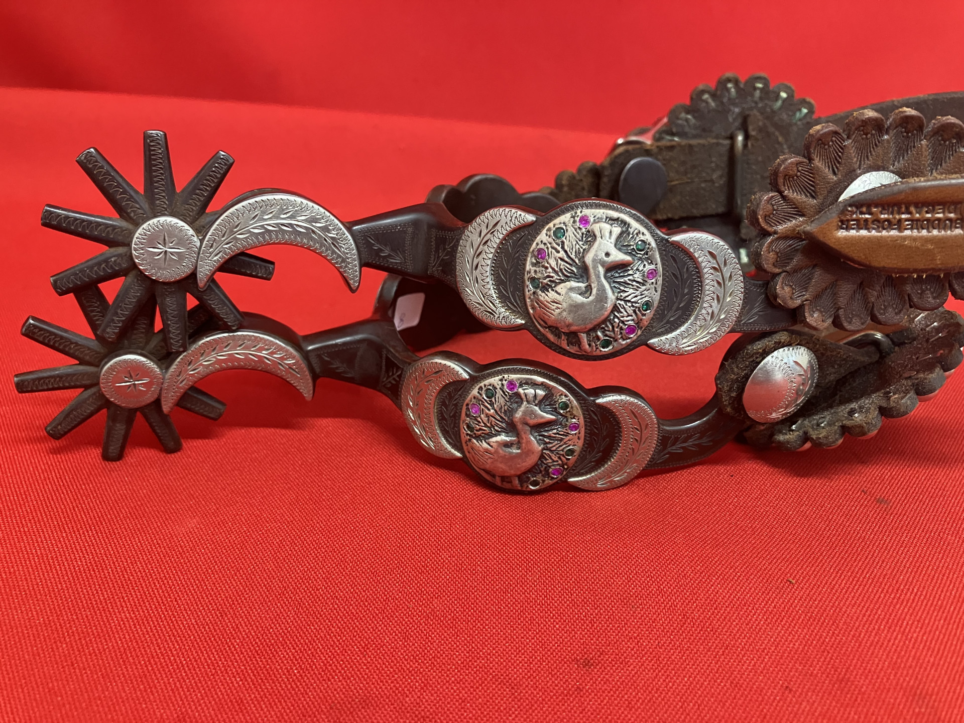 Handmade Bits & Spurs for Sale: JERRY WALLACE PEACOCK SPURS FOSTER STRAP SOLD #200135