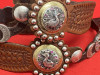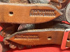 Jerry Wallace unused peacock pattern spurs with matching conchos on marked Buddie Foster straps. Great pair that are double mounted and made with 1 3/4" engraved rowels, 2 3/8" shanks, 3 1/8" heel openings. Fine pair with engraving in the steel. Mr. Jerry makes very little these days. Great pair to add to a collection. We pay shipping within the 48 states. We accept most forms of payment.