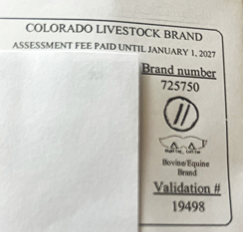 Good Colorado Brand ,,, Assessment paid until January 1,2027 ,,, Horses or Cattle