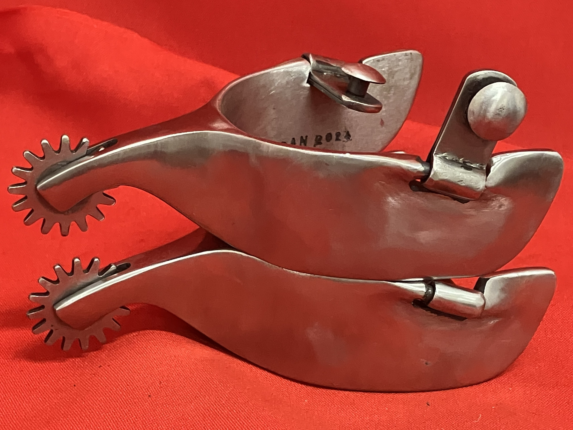 DAN 2025 marked spurs by Dan Wisely long time Texas maker. Made in the style of EF Blanchards No. 3 with 3 7/16" heel openings, 2 1/8" shanks, 1 1/4" rowels, 1 7/16" bands. Quality made for everyday cowboy use. We pay shipping within the 48 states. We accept most forms of payment.