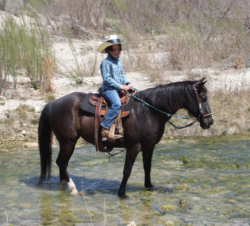 This is by far one of the most honest horses we have ever owned, as gentle, kind and broke as they come. Nasa is a 13 year old mare who has spent most of her life working on the ranch, roping and dragging calves, and toting around the kiddos. We have owned her for nearly 2 years, and she has been the perfect step up horse for my son, who started riding her when he was 8. Nasa is the perfect size at 14.3hh, not too high off the ground but stout enough to pack an adult. She is the type of horse you can turn out for months and then saddle up and hop on without warming up and without worrying that she will do something stupid. Nasa has never offered to buck, rear, bite, kick, or take off, won’t run you under a tree or rub you off on a fence, and is very good minded and forgiving. I don’t have to warm her up before throwing my son up on her, and she has always taken care of him. Nasa has an excellent handle, a good stop, is good on both leads, and will work a gate. She travels out well and can keep up with the big horses out in the pasture. She is very responsive and will walk quietly all day long, but if you ask her to move out she is quick and has a ton of speed. Nasa rides well out in the pasture or in the arena, and while she knows the playday events she does not enjoy doing them. She is a finished heel horse but we have not roped off of her, just used her as a ranch horse and trail horse. She rides just as good bareback with a halter as she does with a saddle and bridle, and doesn’t mind carrying a flag. Nasa rides in a bit as well but we prefer to ride her in a hackamore or bitless bridle. She will go up, over or through anything you point her at, crosses water with no problems, and we haven’t found anything that spooks her or scares her. She has excellent ground manners, stands quietly tied, and the kids can crawl all around her and she will not ever take a step. Nasa is not mare-ish at all, and can be turned out with other mares or geldings without an issue. She will ride out alone or with a group, will happily lead or follow, and has been ridden down the road and in traffic and isn’t bothered by it. The only thing I can pick on her for is that she can be hard to catch in a big pasture. Asking $7500. Call Wendy for more information at 210-363-1883. Serious inquiries only, no tire kickers! Vet checks welcomed. Delivery anywhere in the US is available.