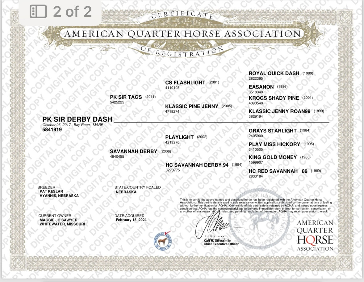 Derby is a 2017 model mare bred to incentive stallion Thrift Shop Fabulous for a late march 2026 foal. She foals easily and breeds back easily. Easy to haul, handle, and breed. Cutting back due to being pregnant, no fault of her own.