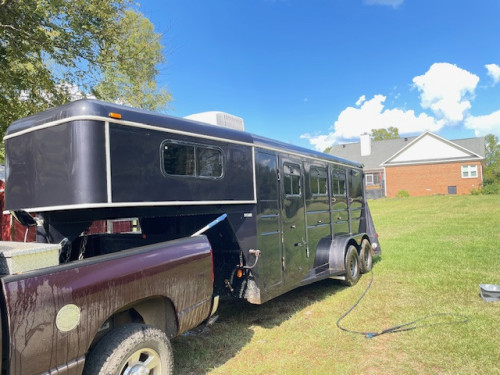 2001 CM Horse 3H Slant, minimal rust, kept under shelter. Has cowboy shower in stall #1 for hookup with propane grill tank. Walk thru door from small living quarters to slant #1. Queen size bed area over gooseneck. Ceiling heat and air that work. Microwave, small inside electric hot water heater, sink, small cabinet. Torsion axles, good rubber, LED tail lights with back up light in center of lights. Also overhead lights inside and outside flood lights, all working. Was painted before I bought it in 2016. I bought a trailer with more living quarters and don’t need this one. Mechanical jack. Rear tack. Solid flooring. NO HOLDING TANKS, NO TOILET $12,000