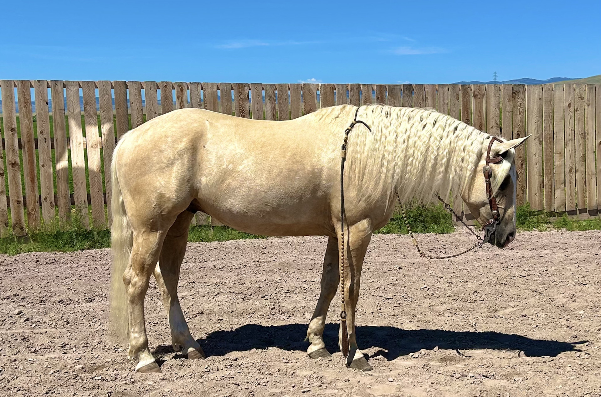 Vintage is that drop dead gorgeous palomino gelding with awhite mane and tail. Vintage is very well built with a great pedigree In addition to personality and his good looks, he also has smooth gaits, walk, trot,and lopes a prettycircle with a huge stop and double fancy spins. Vintage has done all the ranch chores, branded on as well as started out of the box both sides and a blast to sort on. Vintage is one hand broke, soft in his face and sides making him a dream to ride. 100% willing to try anything you ask. Vintage Loves attention, enjoys being bathed, and groomed. He is good with his feet and stands for the farrier. Vintage is a great partner, that is very intelligent and will go all day day.I think Vintage would be best suited for intermediate rider as he loves to go to work but is easy to ride. Stands 15hh and 100% sound in every way. FMI 406-594-8530.