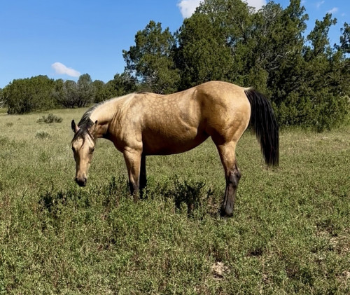 Very flashy buckskin. Lots of chrome in her mane. Bred to do anything with cattle.