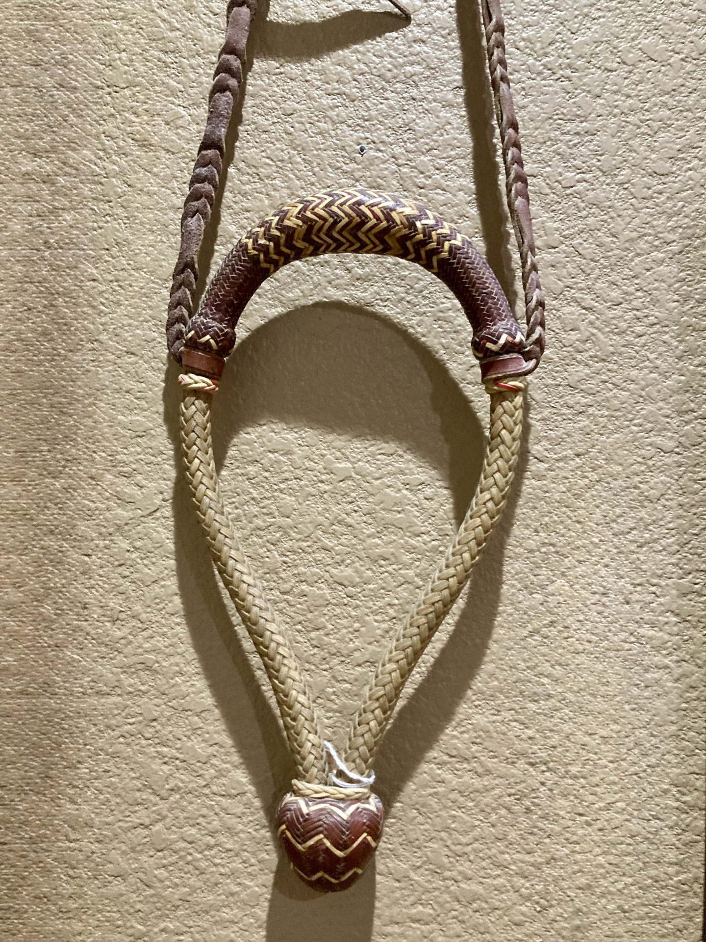 High-quality multicolor leather and rawhide show bosal by Luis Ortega in excellent unused condition. Never been on a horse. Includes original Christmas card signed by Luis & Rose Ortega, original photo of Ortega’s Cowboy Hall of Fame exhibit, and letter of provenance from Rick Nab confirming it came from the estate of his father, Joe Nab.
