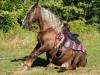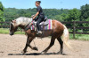 In the arena, he is schooling first level dressage, and would make a dependable show horse. We have bounced him over low jumps, too. He has an easy, balanced canter, and steady trot. In the barn, he stands quietly, even when kids and dogs are underfoot. He clips, bathes, and shoes without a problem. Loads and trailers just fine. Lays down on command. He is sound, with no vices.