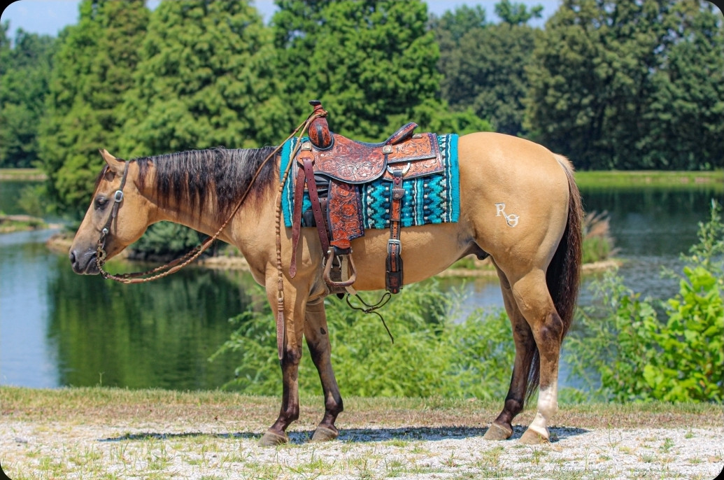 RO Lucky faded genes aka Lucky. Is a beautiful three year old buckskin gelding! With all the talent in the world and has the mindset of a ten year old. This is the gelding that will truly last you a lifetime with stunning looks, great disposition, and rideability. Lucky is willing to do anything you ask him to. Lucky is a very elegant mover with a butter soft trot. and a lope that is smoother than your grandmothers Lincoln town car. He has excellent lead departures, from walk to lope. He sides passes and works gates like a pro. Lucky has ponyed multiple two year olds rode fences, checked cattle, and has been on overnight camping trips ties to the picket line and carried saddle bags for many miles. Lucky has been through a major desensitizing program, and he’s great with traps, bullwhips, guns, traffic, and farm equipment. He has also been over the obstacle course. Lucky is an excellent trial horse. He will cross every creek you point him at, taking each step with precision. He will ride in big groups or alone. The front or the rear with perfection. Lucky is suitable for any level rider. He has impeccable ground manners and loads in and out of any kind of trailer. Lucky stands perfectly for the farrier, clipping and bathing. Lucky also has AQHA royalty bloodlines his sire Dun Faded My Genes was a multiple AQHA world champion rope horse with two ROM’S. Do not miss this chance to own a once in a lifetime gelding with the blood lines of the Great Hollywood Dun It. Lucky sells 100% sound, sane, safe, and up to date on all vaccines. Bid with confidence. Call today for more information. 434-981-3863