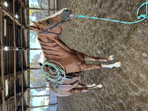 Training: She had a year of ground work and showing and has gone to tons of different places. She has showed in OHSET and 4-H for 2 years. We have qualified for State events in 4-H ground training, in hand trail, showmanship, and OHSET in hand trail! She was started under saddle in August 2024 and has been ridden consistently since then. She has showed under saddle in 4-H open shows and in bonus classes in OHSET. She has solid ground manners, trailers great, stands for the farrier, cross ties, ground ties, behaves well with other horses, and is easy to catch in the field. As for riding, she is solid w/t/c both English and western, can be roped off of, has been on cows, neck reins, rides bridle-less, drags objects, and can be ridden bareback with just a halter and lead rope. We are working on ranch horse stops, rollbacks, and flying lead changes at the moment. She would make a great kids horse since she isn’t spooky and is very gentle with kids of all ages. I have given many kids lessons on her and she’s even been a camp horse at a summer camp!