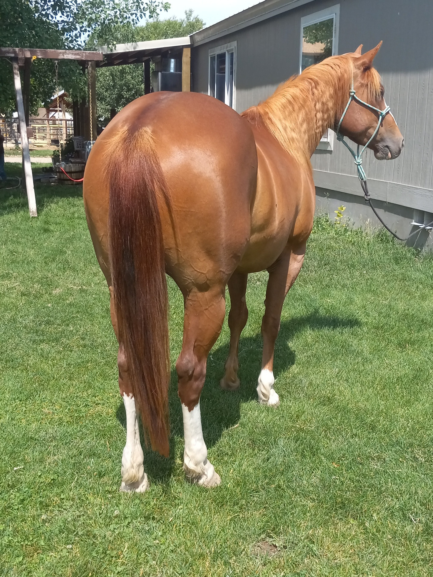 We feel she is best suited for an intermediate to experienced rider as she is still young. We have DNA proof of parentage (Doc’s Laughing Flit x Miss Pepto Balue) but are selling as grade because the stallion owner has yet to file the necessary paper work, but we are still working on it.
