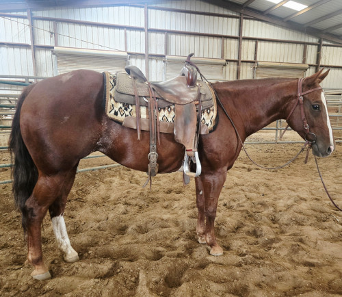 2016 APHA registered chestnut mare. This stout girl stands approximately 14.2 hh. She has primarily been used for aspects of ranch work (gathering, sorting, roping, etc.). She has been introduced to the flag. Eager to learn and highly trainable! This athletic mare would thrive in a wide variety of disciplines! She would excel as a team penning or ranch sorting horse, finish her as a rope horse (started on the heel side), continue to use her as a ranch horse or breed her! This mare would be a great addition to your broodmare band. She has the components to produce quality ranch and performance horses. Very friendly, in your pocket personality. Loads and hauls in the trailer like a dream! Confident intermediate level suitable. PPE welcome at buyers expense. A good home is considered above all! Additional information/pictures/videos available upon request.