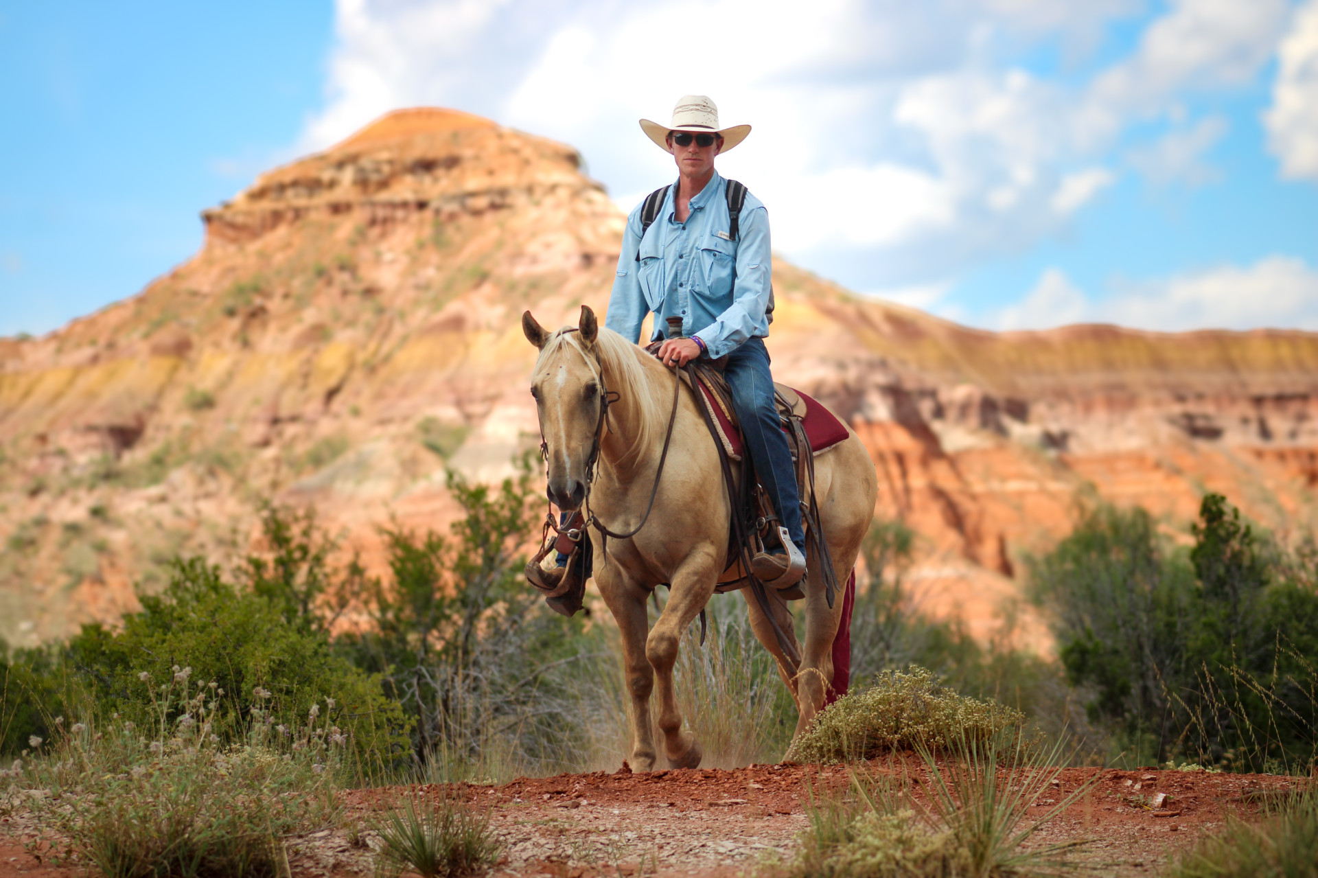 Loveshack has also seen some country. He’s been ridden through creeks and timber back east, and we’ve trail ridden him all through Palo Duro Canyon, across bridges, down steep rocky embankments, up rugged cliffs, and through the quiet flats. He takes it all in stride. Bicycles zoom by, hikers come and go, and he doesn’t so much as flick an ear. He’s steadier on the trail than most people carrying the map.