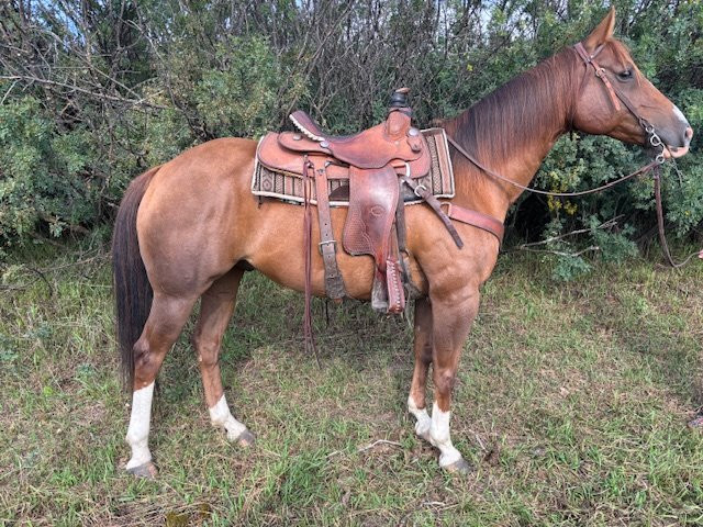 Sage is a 14.3hh sorrel gelding with a heart of gold and the build to carry you anywhere you need to go. He’s quiet, dependable, and steady-minded, yet has the stamina to work all day. Sage has been used in every aspect of ranch work from gathering and sorting cattle to covering miles of country through prairies and mountains, always staying calm and surefooted. He’s also parade and film set seasoned, making him solid in any environment with no spook or nonsense. Sage does have some calcium building up on his right knee, but it doesn’t affect his soundness or ability to work. If you’re looking for a trustworthy partner with experience and try, Sage is ready to step into any job and be valuable addition to your herd.
