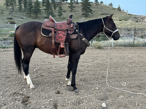 Mo has done everything on the ranch!! From sorting to dragging calves to the fire and big long rides. He is a great gelding to have around the place easy to catch and shoe and load. He is started in the breakaway with slow calves and he is started on the heeling side with a dummy and slow steers. He ain’t very big but he has a big heart and a lot of try.