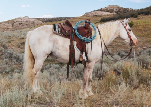 Marshmallow is a 4 year old Gypsy cross gelding that I have owned since he was a long yearling. He is 14 hh tall with a long mane and tail, feathered feet, and one blue eye. Marshmallow is easy to catch, groom, trim, and load. He stands tied quietly for baths, fly spray, and saddling. Marshmallow has been ridden at brandings, gathered cattle, and out on the trails. He crosses water and traverses any terrain. He would excel as a trail horse, ranch pony, or play day horse for the older kids. Although Marshmallow is not for true beginners just yet due to his age, he is absolutely gentle, light in the face, moves off leg ques and neck reins. Marshmallow is built a little uphill, making him appear to some as “roach backed”. His spine has been x-rayed and is straight and non-kissing. This does not affect him. X-ray can be made available to interested parties. He is full of personality and easy to love!