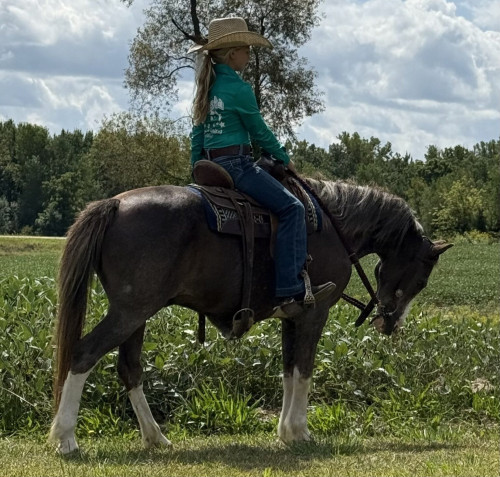 Flash is a 49 inch tall beautiful roan pony that’s safe for any little cowhand. He’s has been ridden by all ages of kids and skill levels and always takes great care of them. He has been ridden all over the ranch doing all tasks. Flash has been to lots of ropings bringing up steers. Been to the famous cow camp rodeo for the weekend camping and being ridden bareback 2 kids deep. He will stand tied to anything from a lawn chair to a red Ryder wagon. He has great manners. He is also good broke to drive. The only vice he has is when stalled he will crib, but not turned out.