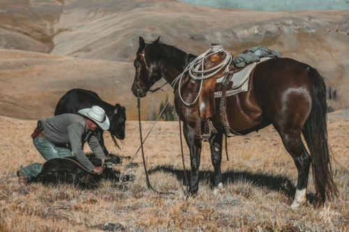 15.1 hands 1200 pounds. Elan is a well-made gelding. I have had him since he was a 2 yr old and he has been one of my main using horses here on the Pitchfork Ranch outside of Meeteetse, Wyoming. He has drug a thousand calves to the branding fire, both in head and heel brandings as well as heel and drag brandings. He has been packed on elk hunts as a 4 year old and spent the summer of 2025 with me up in cow camp on the forest permit. We have roped and doctored yearlings and cows. He is sure footed, heavy boned, and conformationally correct. He is tough and will go all day. He rides out very well alone and is not horse sour or barn sour in any way. He is correct in his circles, leads, transitions and soft in the face and body with a pretty nice stop and turn around. Big enough to be your next head horse, ranch horse, or hunting and trail horse. He is not for a beginner but would suit a competent rider as he can be a little watchy on the ground. He is very good to shoe. Loads, ties, and hauls well and is easy to catch out in big pastures with a little grain. Elan has never been to a sale or traded around and has been with me since I started him.