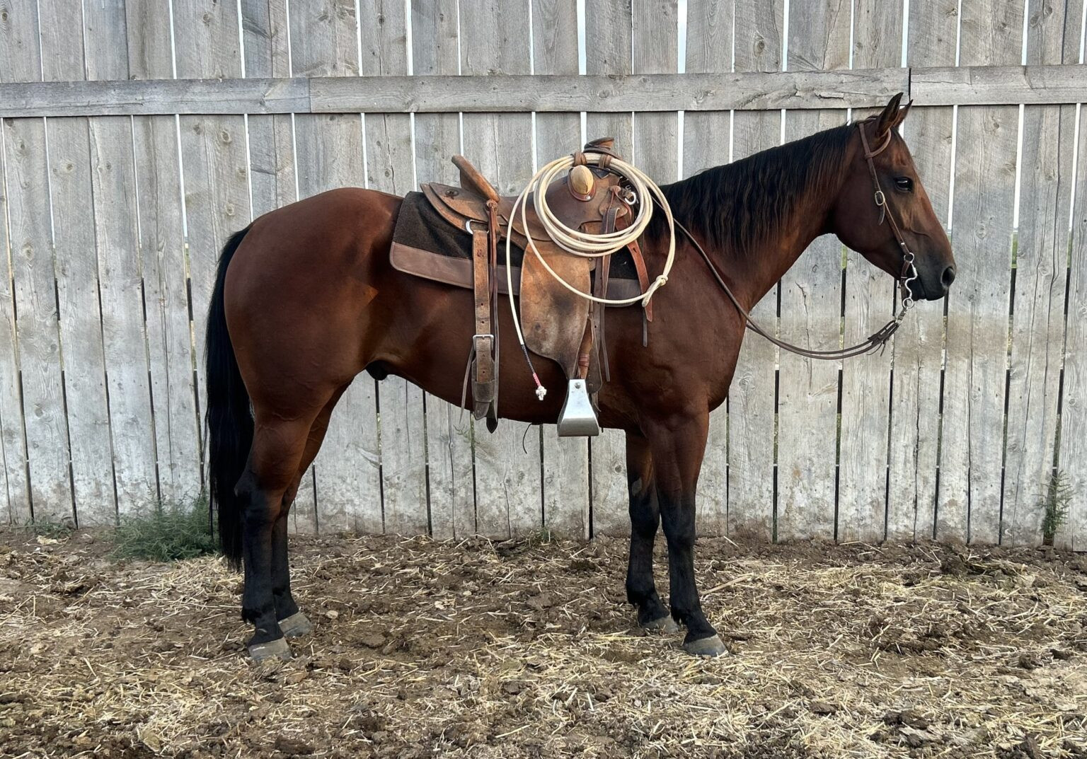 Doc is a 15.2 hand bay gelding that I have been using here on the ranch for the past 2 years. He’s been used extensively for day-to-day ranch work—gathering, sorting, working gates, branding, doctoring, and checking fence in the hills on the Idaho/Wyoming border he’s done it all, and wil go wherever you point him. He’s been started on the head side this summer and is coming along good, he’s the calm and quiet type when working in a herd, learns quickly and loves his job. He’s got a good easy going personality and picks up on things really quick. He’s got a cosmetic scar right above his back right hoof from hooking a loose board in the coral a little over a year ago but other than that no other scars. He’s had 2 years of solid ranch work and is ready to be finished out as your next head horse or continue his career as a ranch horse. Please feel free to call or text with any questions or for additional pictures/videos. If you call and I don’t answer shoot me a text as I’m usually out of service this time of year and I’ll call you back.